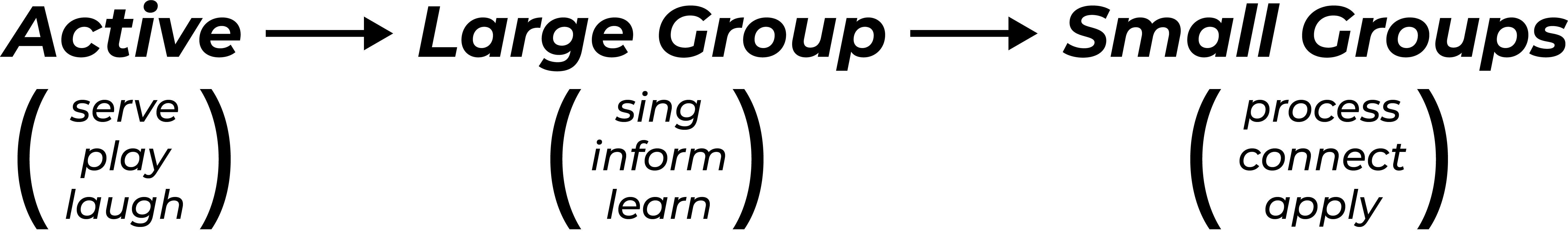 We follow an ACTIVE > LARGE GROUP > SMALL GROUPS flow (see below).
