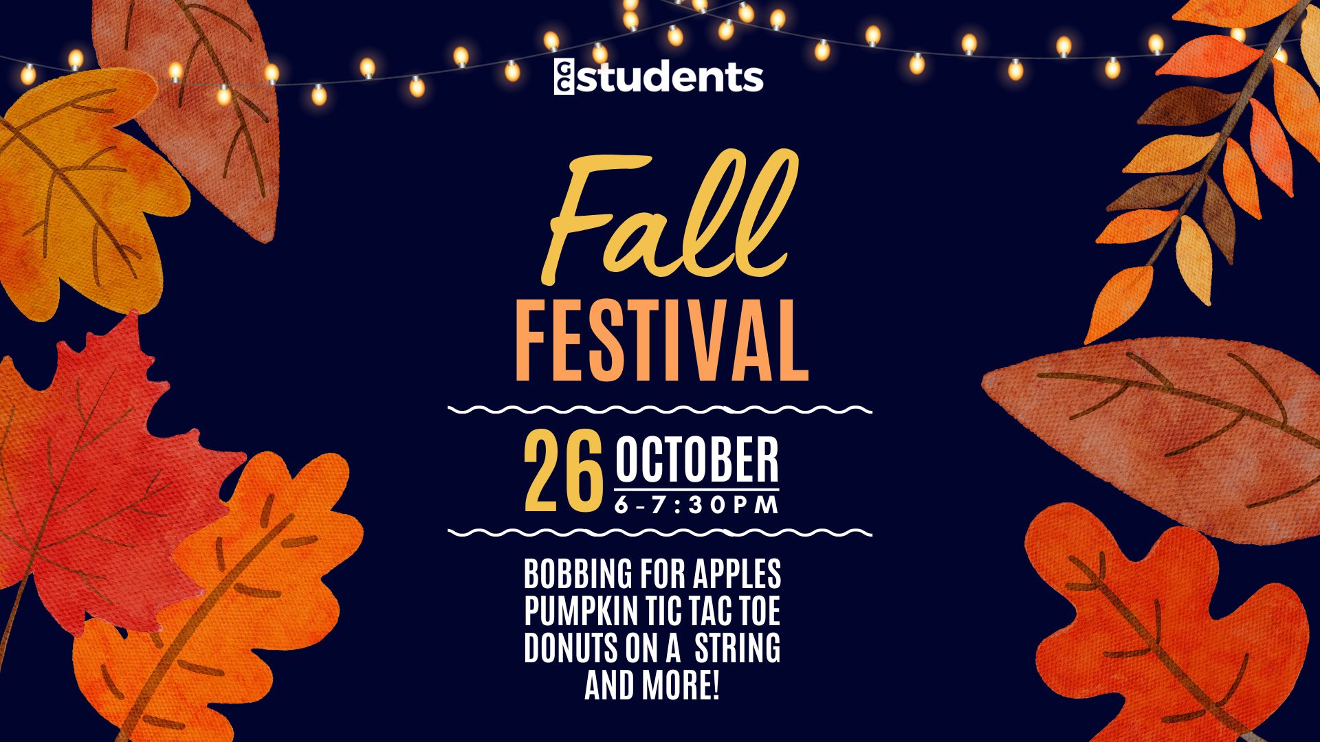 On Sunday, October 26th from 6pm - 7:30pm we're hosting the Fall Festival! This is a *great* event to invite JH & HS friends to. Students should come in costume for the costume contest and be ready to play games, bob for apples, eat donuts on a string, and win prizes!