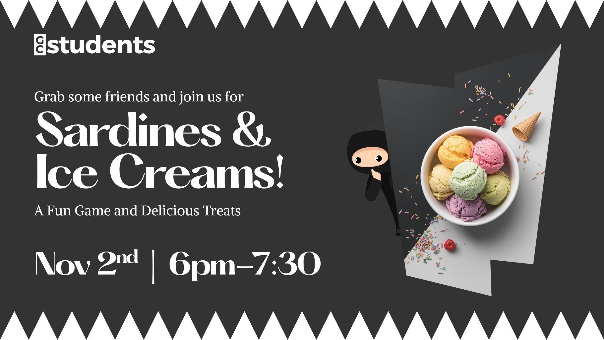 We're kicking off November with a super-fun night of Sardines (the game--like hide and seek, but the opposite) and ice cream! This is a perfect event to invite some friends to, have some fun, and relax with each other and some sweet treats. Open to JH & HS students at our normal Sunday evening time of 6pm-7:30pm.
