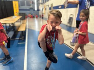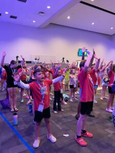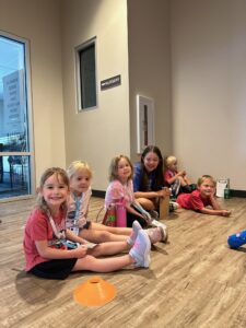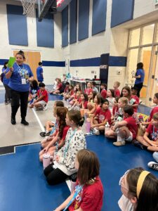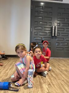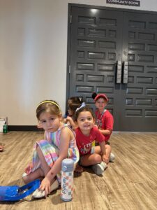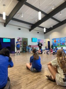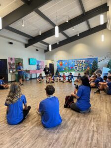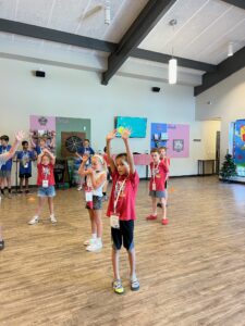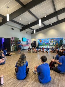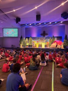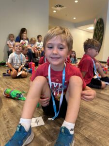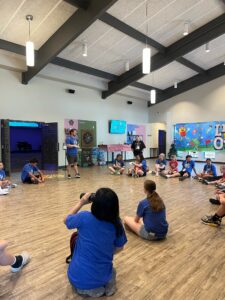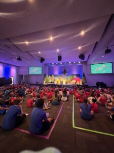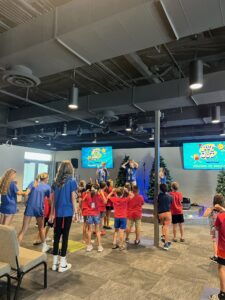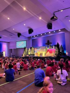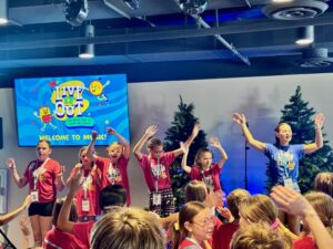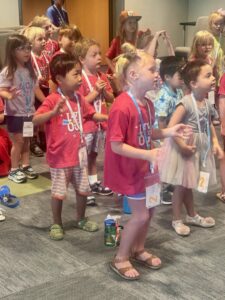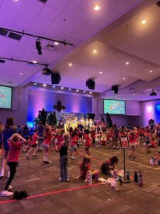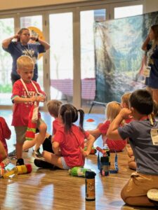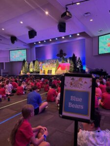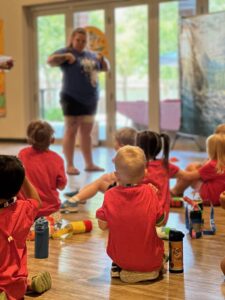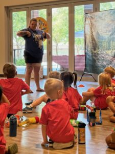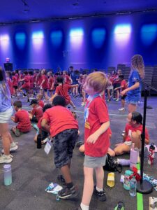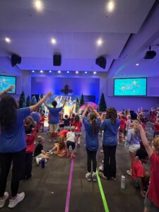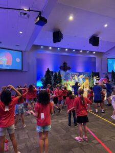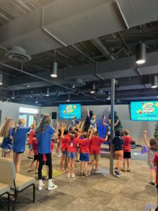We start and end each day with large group where we sing, dance, play, and hear about the day's Bible theme and message.
